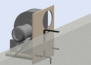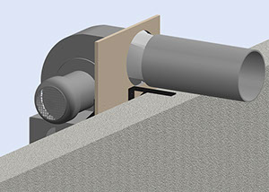 Le concept développé comprend d’abord le souffleur monté sur une construction de tubulure d’acier et contreplaqué. Le tout est fixé solidement au mur, mais à une distance d’environ 10 cm pour permettre l’écoulement de la neige. Par la suite, viennent se greffer clapet anti-retour, adaptateur et tuyau de conduit. Dans le cas du ballon interne, il y a un long tube annelé qui traverse le tuyau de conduit. Pour servir de réceptacle à la voilure, il y a une capote de polyéthylène rigide. Elle comporte deux protubérances dans l’axe de la voilure pour l’étanchéité.