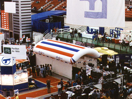 Très élémentaire comme toiture à double membrane et d'une certaine façon, c'est sa simplicité qui fait son charme. C'était au Salon de la Jeunesse à Montréal, au début des années'80. Le client était un organisme qui faisait la promotion du tir à l'arc avec démonstrations sur place. Le mandat était de couvrir un espace de 5 mètres (16') par 10 m pour empêcher des flèches de s'échapper hors de l'enclos. Sur trois côtés, c'était uniquement des filets. Étonnamment, ceux-ci suffisent pour arrêter une flèche. Mon collègue et moi avions dix jours pour trouver une solution et livrer le produit.