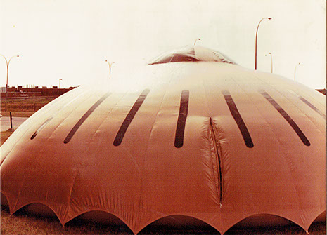 C'est en 1988, la station de radio CKOI à Montréal souhaitait faire un bon coup pour le 1er avril et on m'avait commandé une "soucoupe volante". L'idée était de l'installer sur un petit îlot près du Pont Champlain. On misait sur la curiosité et la crédulité pour créer un événement. Malheureusement, le 1er avril tombait le Vendredi Saint et le pont était désert.