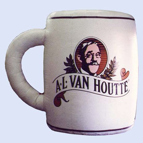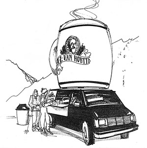 Sur l'illustration, on peut voir de la vapeur s'échapper de la tasse. C'est qu'elle venait avec au petit chauffe-eau pour simuler la réalité d'un café chaud. On aurait pu aussi faire émaner son arôme. Cependant, comme ça se passait essentiellement dans des centres de ski, pour des raisons de logistique, je crois qu'on a utilisé le chauffe-eau qu'une seule fois. (1987)