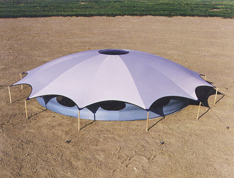 • Les seuls éléments de structure rigides sont des pattes stabilisatrices de 2,5 ou 3 mètres, une par ancrage. Quant aux membranes, elles se plient en différents ballots manipulables.